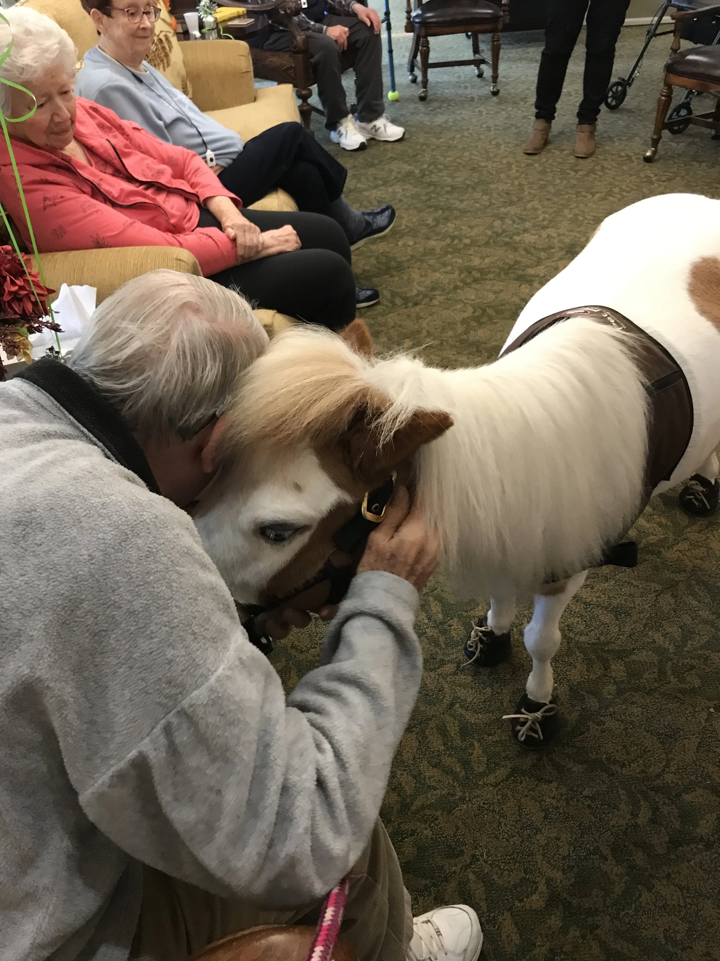 Visits may be held in an outside area, recreational room, or in a patient’s room. Betsy and Roxy are accustomed to being indoors, riding in elevators, and navigating around tables and chairs. Visits include petting and interacting with Betsy or Roxy, a photo if desired, and of course conversation!